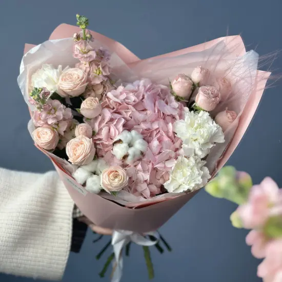 Нежные оттенки розового, белого и кремового переплетаются в воздушной гармонии, напоминая о первых трепетных чувствах. Хлопок добавляет легкость, а маттиола – едва уловимый аромат, превращая букет в живое воплощение нежности.