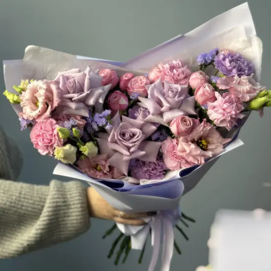 Сиреневые оттенки создают ощущение легкости и воздушности, напоминая о первых весенних цветах. Переливы розовых и лавандовых тонов добавляют глубину, а кружевные соцветия эустомы придают композиции особую нежность. Букет словно окутан дымкой – элегантный и в то же время трогательный.