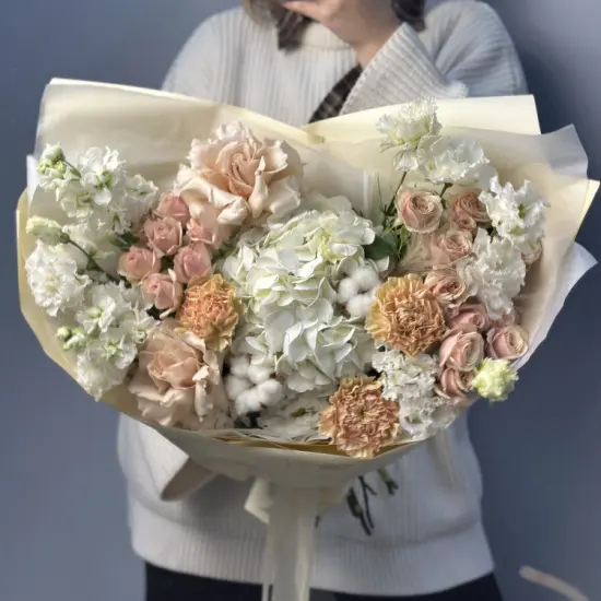 Нежные оттенки розового, кремового и бежевого создают ощущение тепла и легкости. Гортензия придает объем, маттиола наполняет воздух тонким ароматом, а сухоцветы добавляют текстуру и природную графичность. Композиция словно впитала мягкий свет заката – она одновременно яркая и приглушенная, живая и застывшая во времени.