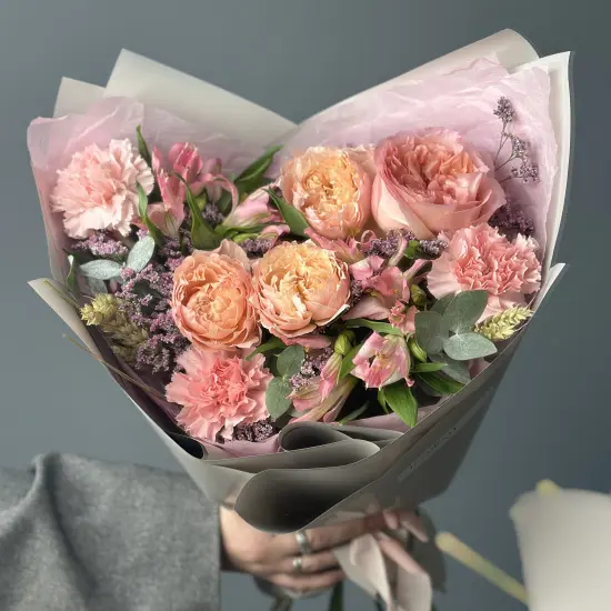 Каждая композиция собирается вручную с учетом доступных цветов, сохраняя задуманную палитру и настроение. Оттенки и пропорции могут варьироваться, но качество и гармония остаются неизменными – флористы подбирают материалы так, чтобы букет выглядел цельно и выразительно.