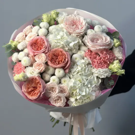 Нежные оттенки розового, кремового и персикового переплетаются в воздушной текстуре, создавая ощущение легкости и тепла. Крупные бутоны роз гармонируют с кружевными соцветиями гортензий, а хризантемы и эустома добавляют объем и динамику – композиция словно светится изнутри, передавая искренние эмоции.