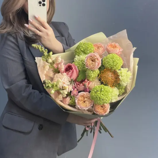 Состав может варьироваться в зависимости от сезонности цветов, но концепция и уровень исполнения остаются неизменными. Флористы подбирают аналоги по текстуре и колористике, сохраняя задуманный образ. Каждая композиция – авторская работа, где вариативность лишь подчеркивает уникальность.