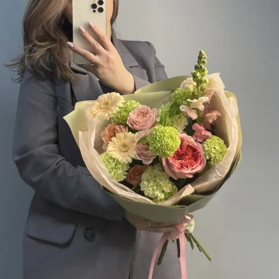 Летний сад в миниатюре: сочные оттенки роз и гербер перекликаются с нежными соцветиями антирринума, а шарики вибурнума добавляют графичности. Зелень создает ощущение свежести, будто цветы только что собраны в поле. Композиция дышит легкостью и естественной гармонией – без излишней пышности, но с выразительным характером.