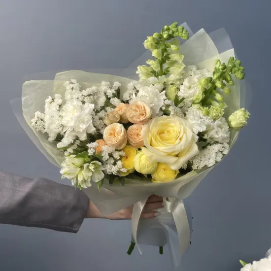 Каждая композиция собирается индивидуально – флористы подбирают цветы, сохраняя задуманную палитру и стиль. Оттенки и размеры элементов могут варьироваться в зависимости от сезона, но гармония и качество остаются неизменными.