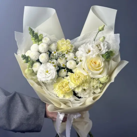 Состав может варьироваться в зависимости от сезона, но стиль и качество остаются неизменными. Флористы подбирают аналогичные по фактуре и тону цветы, сохраняя гармонию букета. Каждая композиция собирается индивидуально – с учетом доступных материалов и общей концепции.