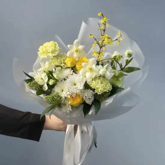 Солнечные оттенки желтого, персикового и белого создают ощущение весеннего сада – легкого, наполненного свежестью и тонким ароматом. Форзиция добавляет воздушности, а бархатистые розы придают композиции мягкую объемность.