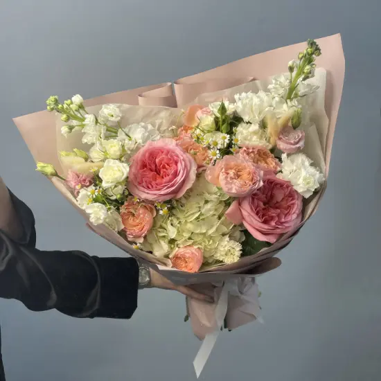 Солнечные оттенки роз и ромашек перекликаются с пастельными тонами гортензий, а воздушные гвоздики и маттиола добавляют легкости. Лагурус придает композиции природную фактурность, напоминая о летних лугах. Букет выглядит одновременно ярко и изысканно – сочетание цветов передает тепло и свежесть солнечного дня.