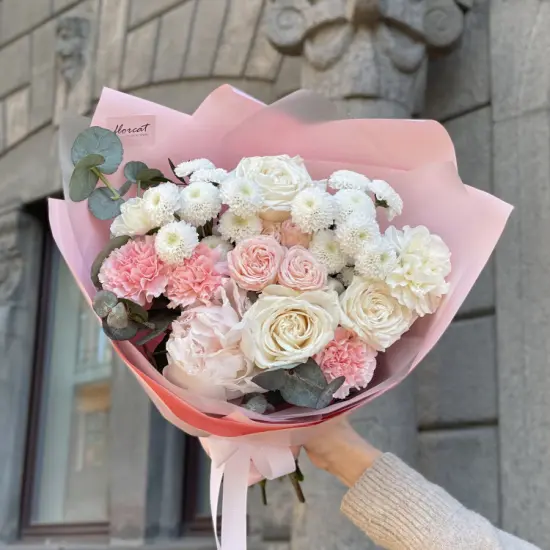 Лёгкие переливы розового и белого создают ощущение свежести, словно первые лучи солнца на рассвете. Мягкие лепестки пионов и роз переплетаются с воздушными соцветиями хризантем, а зелень эвкалипта добавляет ноту природной гармонии. Композиция передаёт нежность пробуждающейся природы и тёплое предвкушение весны.
