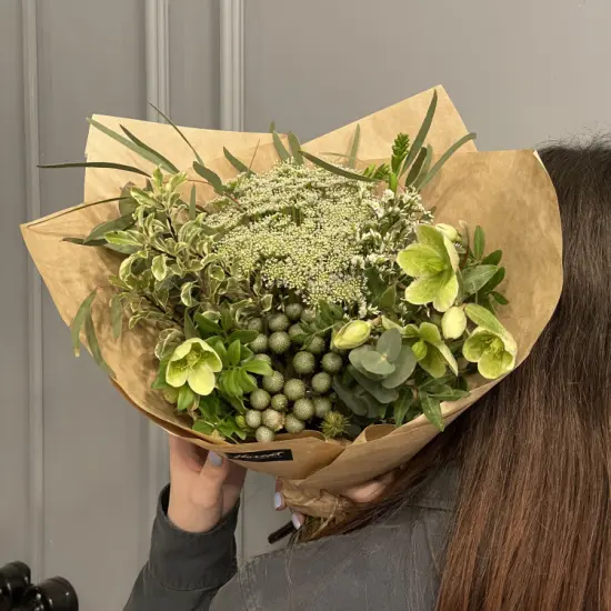 Зеленый в крафте — летний сборный букет в свежих оттенках с множеством интересных деталей, утопающий в зелени. Собран в полевом стиле и упакован в стильный крафт.Размер сборного букета Зеленый в крафте S - около 30 см