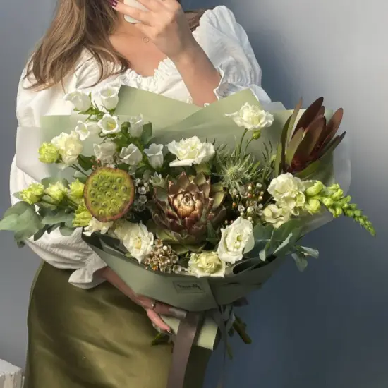 Контраст фактур и оттенков рождает ощущение гармонии: бархатистые лепестки лотоса перекликаются с графичными линиями артишока, а нежные соцветия эустомы смягчают динамику композиции. Букет словно вобрал в себя тепло летнего сада – свежий, выразительный, с легким намеком на средиземноморский колорит.