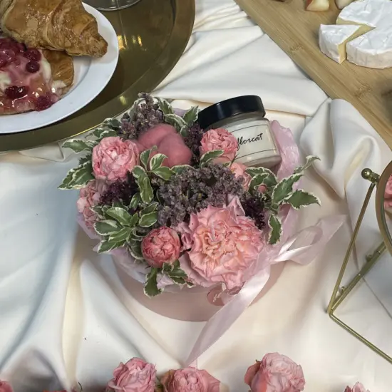 Нежные лепестки роз переплетаются с воздушными соцветиями хлопка, создавая ощущение легкости и гармонии. Приглушенные оттенки розового и бежевого добавляют композиции теплоты, а свеча дополняет атмосферу уюта. Каждый элемент подобран так, чтобы букет выглядел цельно и изысканно – без лишней пестроты, но с акцентами на текстурах и объемах.