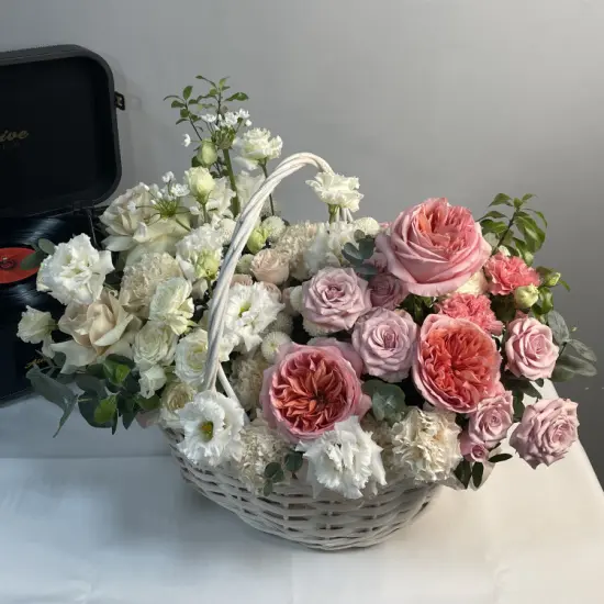 Нежная цветочная композиция, выполненная из россыпи пионовидных и классических роз, веточек нежной эустомы, фактурных гвоздик, белого аллиума и свежей зелени в плетеной корзине, поможет выразить ваши чувства, передать любовь, тепло и трепет.Размер пышной цветочной корзины - около 70 см