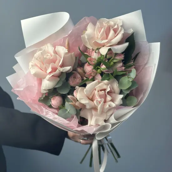 Нежные оттенки розового и белого создают ощущение легкости, напоминая о первых ягодных спелых плодах. Тонкие линии лагуруса и фактурные листья эвкалипта добавляют динамики, а плотные бутоны роз придают композиции объем и выразительность.