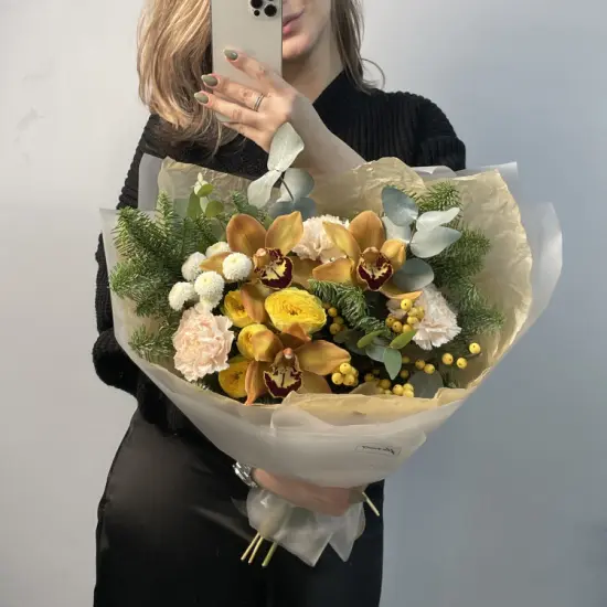 Холодное сияние орхидей перекликается с теплым мерцанием ягод, создавая контраст между нежностью и яркостью. Еловые ветви добавляют объем и лесной аромат, а округлые формы гвоздик смягчают графичность композиции. Получается баланс праздничной торжественности и уютной природной гармонии.
