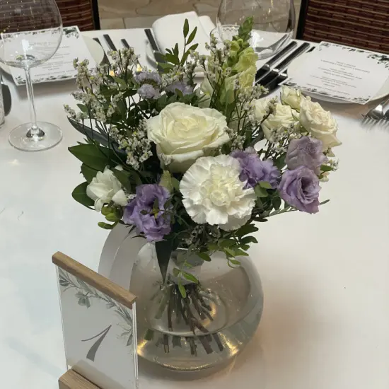 Изящный букет, собранный в классической стилистике из крупных сортовых роз, фактурных шариков эустомы, полевого антирринума, лимониума и свежей зелени.Букет размещается в стильную вазу. Размер букета - около 30 см 4320