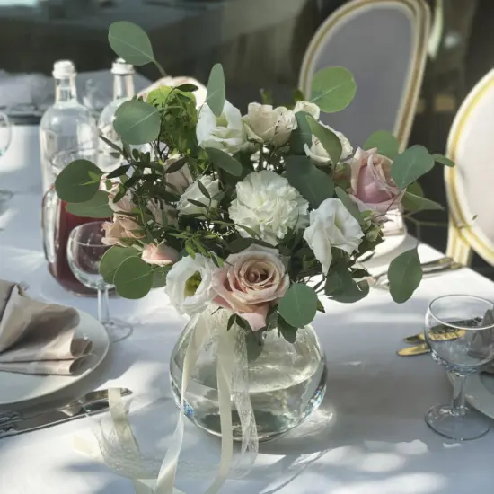 Изящный букет, собранный в классической стилистике из крупных сортовых роз, фактурных шариков эустомы, гвоздик и свежей зелени.Букет размещается в стильную вазу. Размер букета - около 30 см 4800