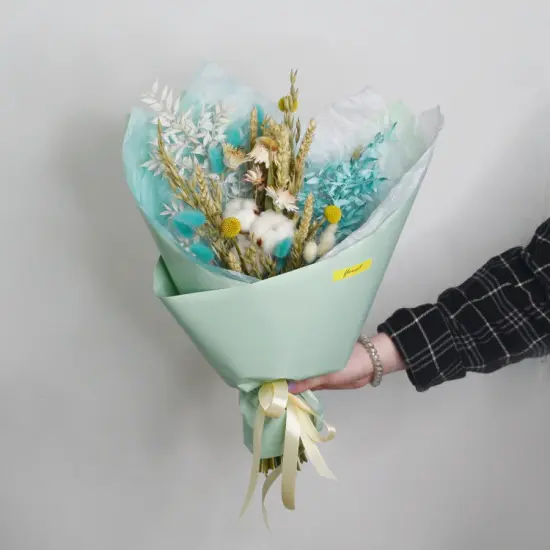 Букет сухоцветов Лето у моря выполнен в светлой голубой гамме с желтыми акцентами: воздушный хлопок, стабилизированный рускус, колоски пшеницы и овса, краспедия и гелихризум навевают мысли о лазурном море, солнце и отпуске.Размер букета сухоцветов Лето у моря - около 25-30 см