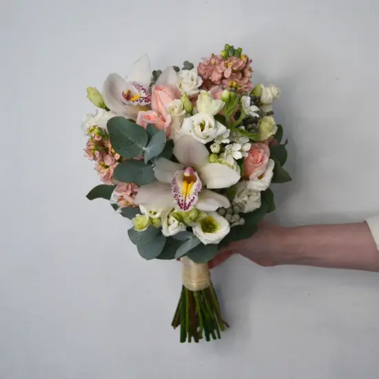 Свадебный букет невесты, в составе которого использованы роскошные орхидеи, пионовидные розы, медовая маттиола, воздушная эустома и эвкалипт, исполнен в классическом стиле. На фото - пример свадебного букета, который наши опытные флористы исполнят для Вас с любыми изменениями бюджета, состава, цветовой гаммы и размера, чтобы улыбка на Вашем лице сияла на протяжении всего торжества. Также мы с радостью подберем подходящую по стилю бутоньерку, которая дополнит образ Вашей красивой пары.Мы понимаем, что свадьба - особенный день, который должен пройти идеально. Часть Вашей предсвадебной подготовки, а именно создание совершенного букета, мы берем на себя.
