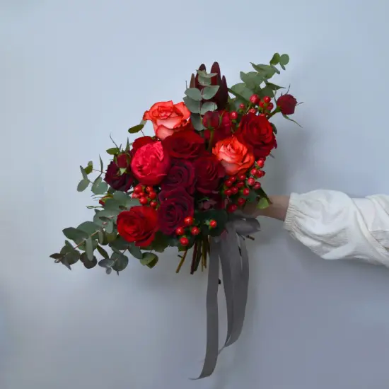 Свадебный букет невесты, в составе которого использованы пионовидные и классические розы, ягодки гиперикума и эвкалипт, исполнен в современном раскидистом стиле. На фото - пример свадебного букета, который наши опытные флористы исполнят для Вас с любыми изменениями бюджета, состава, цветовой гаммы и размера, чтобы улыбка на Вашем лице сияла на протяжении всего торжества. Также мы с радостью подберем подходящую по стилю бутоньерку, которая дополнит образ Вашей красивой пары.Мы понимаем, что свадьба - особенный день, который должен пройти идеально. Часть Вашей предсвадебной подготовки, а именно создание совершенного букета, мы берем на себя.
