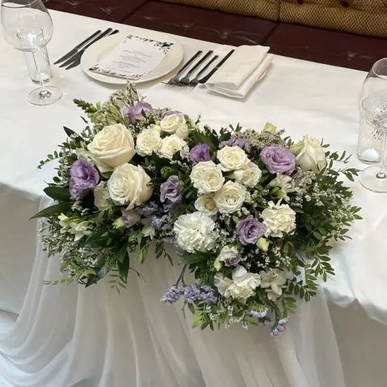 Пышная композиция для украшения стола молодоженов, составленная из крупных роз, эустомы, гвоздик, лимониума, фактурной зелени и кустовых роз.Композиция выполнена на флористическом поддоне. Размер композиции - около 55 см 13040
