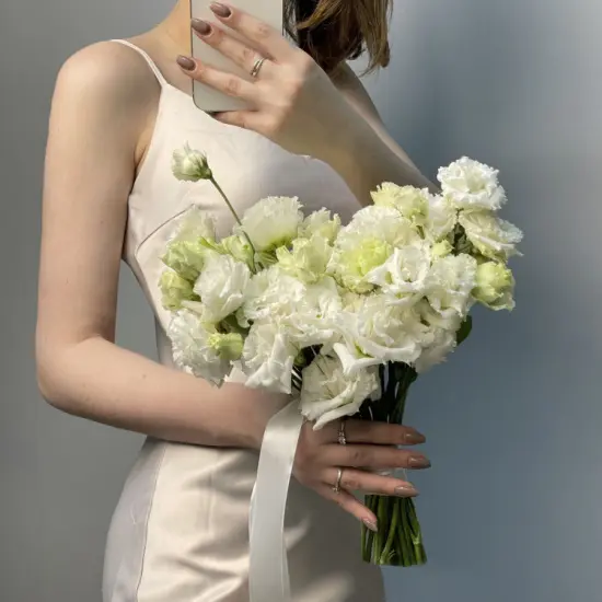 Легкие лепестки эустомы словно окутывают свадебный наряд воздушной дымкой, придавая образу нежности и романтичности. Букет становится не просто аксессуаром, а частью торжества – он дополняет атмосферу праздника, наполняя ее теплом и гармонией. Каждый цветок словно хранит в себе частицу этого особенного дня, делая его еще более запоминающимся.