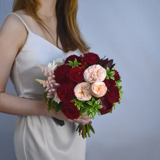 Мягкие переливы персикового и насыщенный марсала придают букету романтичное и в то же время торжественное звучание. Он словно излучает тепло и нежность, дополняя образ невесты и создавая атмосферу уюта и праздника. Каждый элемент – от пышных пионов до воздушной астильбы – добавляет букету объем и динамику, делая его живым и выразительным акцентом свадебного дня.