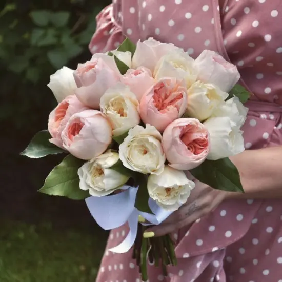 Букет словно наполнен солнечным светом и теплом – его мягкие переливы оттенков создают ощущение нежности и радости. Он станет не просто аксессуаром, а частью свадебной истории, дополняя образ и добавляя торжеству утонченности. Пионовидные розы дарят атмосферу безмятежности, превращая момент в кадр из сказки.