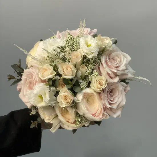 Свадебный букет невесты, в составе которого использованы эустома, вероника, россыпь сортовых роз различных сортов, папоротник и веточки эвкалипта, исполнен в классическом стиле. На фото - пример свадебного букета, который наши опытные флористы исполнят для Вас с любыми изменениями бюджета, состава, цветовой гаммы и размера, чтобы улыбка на Вашем лице сияла на протяжении всего торжества. Также мы с радостью подберем подходящую по стилю бутоньерку, которая дополнит образ Вашей красивой пары.Мы понимаем, что свадьба - особенный день, который должен пройти идеально. Часть Вашей предсвадебной подготовки, а именно создание совершенного букета, мы берем на себя.