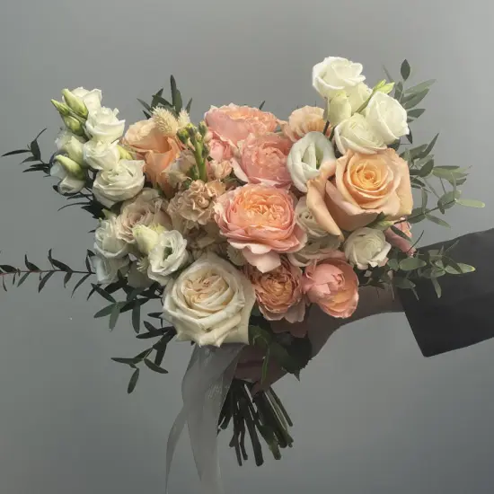 Легкость и романтичность букета наполняют свадебный день теплом и трепетом – мягкие линии роз, воздушность эустомы и тонкий аромат маттиолы создают атмосферу нежности. Такой букет становится не просто аксессуаром, а частью истории – он подчеркивает эмоции момента, добавляя образу завершенность и гармонию.