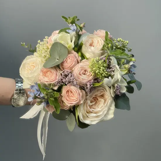 Букет создает атмосферу романтики и нежности, словно вплетая в свадебный день частичку природной гармонии. Мягкие линии и натуральные оттенки придают образу невесты утонченность, а свежесть цветов наполняет пространство едва уловимым ароматом. Такой букет становится не просто аксессуаром, а важной частью свадебной истории – естественной и трогательной.