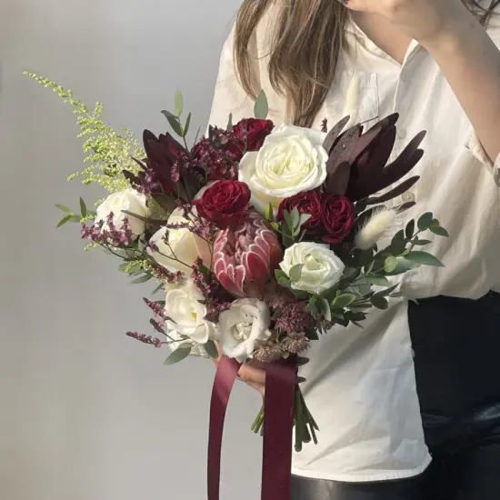 Легкость астильбы и бархатистость роз создают ощущение воздушности, будто букет только что собран в цветущем саду. Протеи добавляют ноту неожиданности, а серебристый эвкалипт придает свежести – такой акцент идеально дополнит романтичный образ невесты. Каждый элемент словно наполнен светом, превращая букет в живой аксессуар, который подчеркнет торжественность момента.