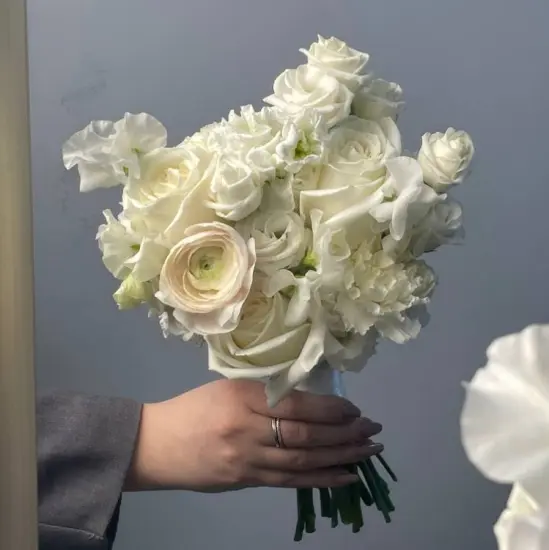 Легкость латируса и тонкий аромат маттиолы придают букету ощущение воздушности, а насыщенные оттенки роз и ранункулюсов добавляют торжественности. Такой букет становится не просто аксессуаром, а частью свадебной атмосферы – он подчеркивает эмоции момента, сохраняя элегантность и индивидуальность.