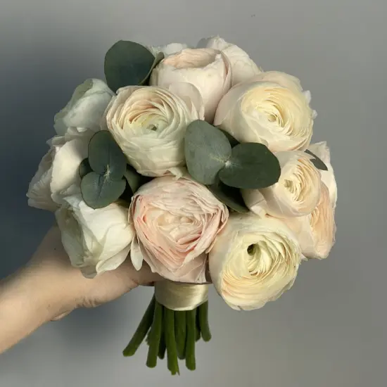 Ранункулюсы придают букету воздушность и романтичность, словно подчеркивая легкость момента. Их мягкие переливы оттенков создают ощущение гармонии, а естественная форма бутонов добавляет композиции природной элегантности. Такой букет станет не просто аксессуаром, а частью свадебной истории – неброской, но запоминающейся деталью, которая дополнит атмосферу праздника.