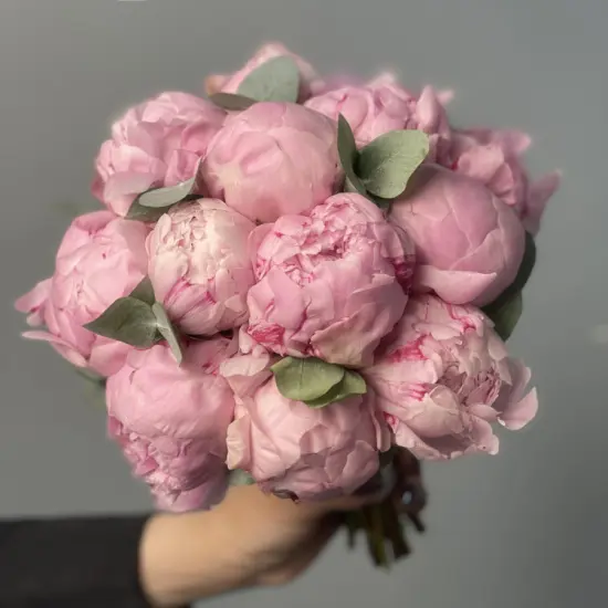 Свадебный букет невесты из 15 розовых пионов и эвкалипта