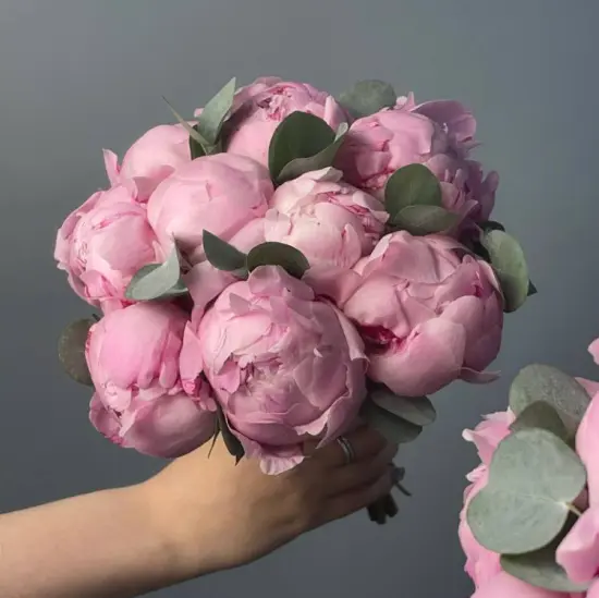 Свадебный букет невесты, в составе которого использованы пышные розовые пионы и веточки эвкалипта, исполнен в классическом стиле. На фото - пример свадебного букета, который наши опытные флористы исполнят для Вас с любыми изменениями бюджета, состава, цветовой гаммы и размера, чтобы улыбка на Вашем лице сияла на протяжении всего торжества. Также мы с радостью подберем подходящую по стилю бутоньерку, которая дополнит образ Вашей красивой пары.Мы понимаем, что свадьба - особенный день, который должен пройти идеально. Часть Вашей предсвадебной подготовки, а именно создание совершенного букета, мы берем на себя.