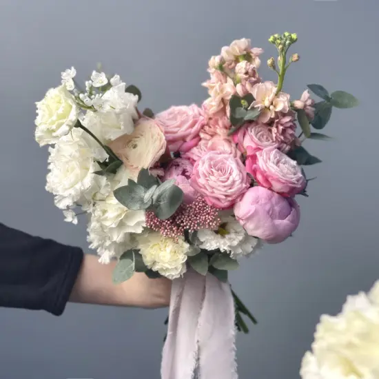 Легкость пионов, тонкий аромат маттиолы и изящные линии ранункулюсов создают ощущение воздушности и романтики. Букет словно впитал в себя тепло летнего утра – он не просто дополняет наряд невесты, а становится частью свадебной атмосферы, наполненной нежностью и светом.
