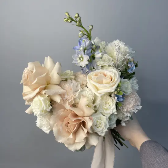 Свадебный букет невесты, в составе которого использованы нежные сортовые розы, дельфиниум, твидия, эустома и гвоздики, исполнен в современном стиле. На фото - пример свадебного букета, который наши опытные флористы исполнят для Вас с любыми изменениями бюджета, состава, цветовой гаммы и размера, чтобы улыбка на Вашем лице сияла на протяжении всего торжества. Также мы с радостью подберем подходящую по стилю бутоньерку, которая дополнит образ Вашей красивой пары.Мы понимаем, что свадьба - особенный день, который должен пройти идеально. Часть Вашей предсвадебной подготовки, а именно создание совершенного букета, мы берем на себя.