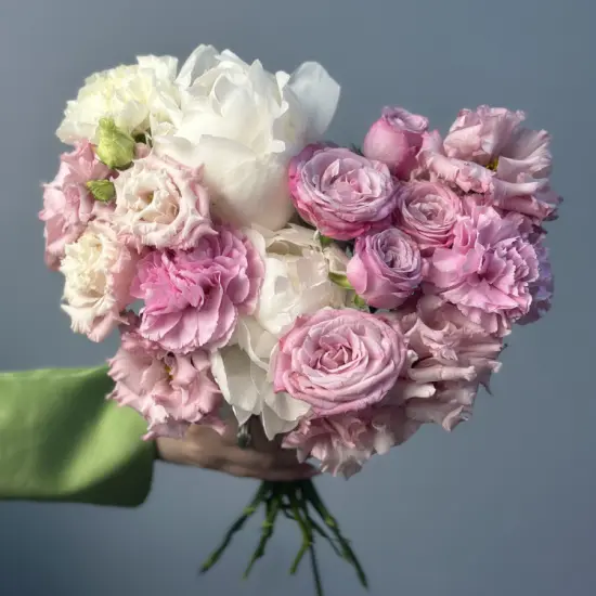 Этот букет словно наполнен светом и легкостью, передавая ощущение праздника и счастья. Он станет не просто аксессуаром, а частью свадебной истории, подчеркивая индивидуальность момента. Пионы и розы дарят романтичное настроение, а эустома добавляет тонкую изысканность, создавая атмосферу, которая запомнится надолго.