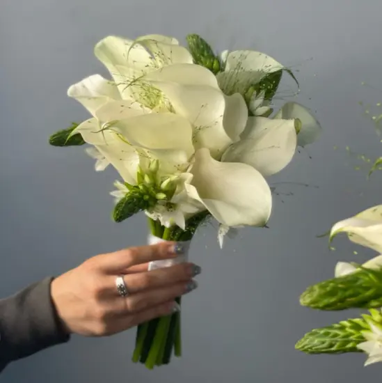 Свадебный букет в современной технике, в составе которого использовано 11 изящных белых калл, веточки стойкого орнитогалума и паникум. На фото - пример свадебного букета, который наши опытные флористы исполнят для Вас с любыми изменениями бюджета, состава, цветовой гаммы и размера, чтобы улыбка на Вашем лице сияла на протяжении всего торжества. Также мы с радостью подберем подходящую по стилю бутоньерку, которая дополнит образ Вашей красивой пары.Мы понимаем, что свадьба - особенный день, который должен пройти идеально. Часть Вашей предсвадебной подготовки, а именно создание совершенного букета, мы берем на себя.