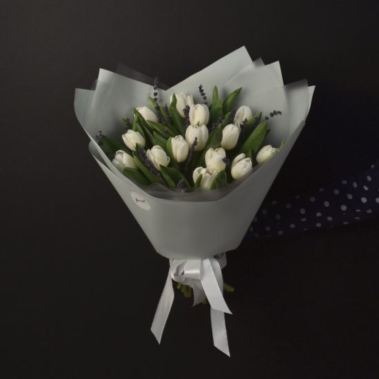 Букет из 15 белых тюльпанов и лаванды