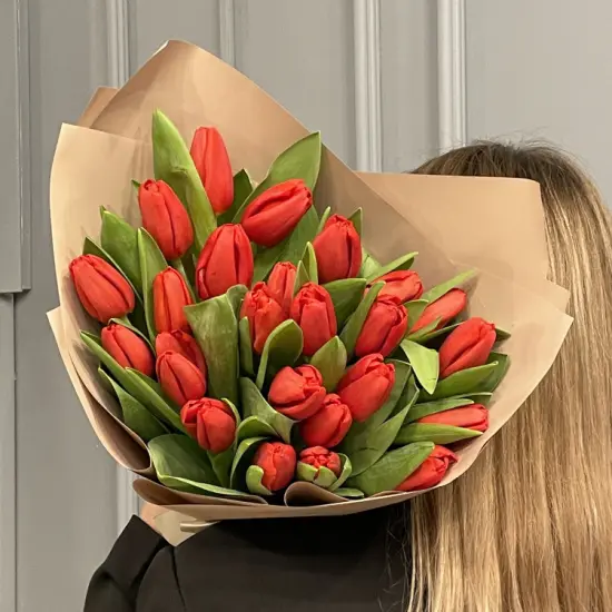 Букет из 25 тюльпанов красного оттенка - пышный весенний подарок. Тюльпаны - хрупкие цветы, обладающие особым шармом. Букеты тюльпанов создают нежное весеннее настроение, их приятно дарить и получать!Тюльпаны очень красиво раскрываются, превращаясь из плотных бутонов в пышные цветки.