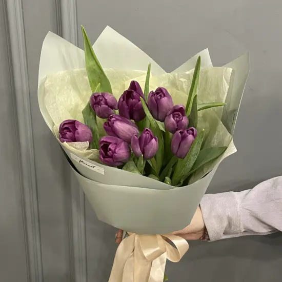 Букет из 9 тюльпанов фиолетового оттенка - пышный весенний подарок. Тюльпаны - хрупкие цветы, обладающие особым шармом. Букеты тюльпанов создают нежное весеннее настроение, их приятно дарить и получать!Тюльпаны очень красиво раскрываются, превращаясь из плотных бутонов в пышные цветки.
