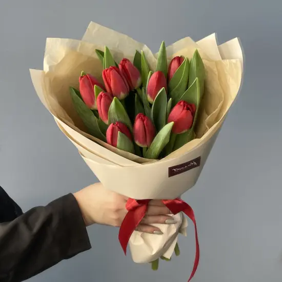 Букет из 9 тюльпанов красного оттенка - пышный весенний подарок. Тюльпаны - хрупкие цветы, обладающие особым шармом. Букеты тюльпанов создают нежное весеннее настроение, их приятно дарить и получать!Тюльпаны очень красиво раскрываются, превращаясь из плотных бутонов в пышные цветки.