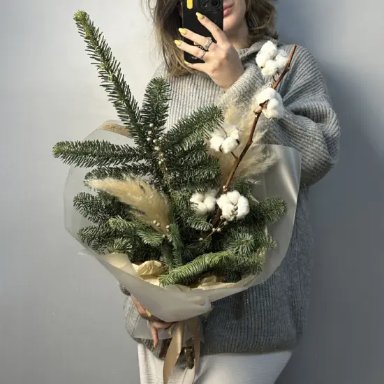 Строгие линии хвойных ветвей сочетаются с мягкими пушистыми соцветиями, образуя гармоничный контраст фактур. Приглушенные природные оттенки – серебристо-зеленый, бежевый, кремовый – передают атмосферу зимнего леса, наполненного тишиной и спокойствием.