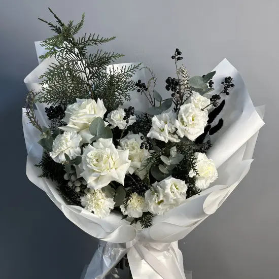Очаровательный букет с зимним настроением. Собран из ароматной туи, синих ягодок лигуструма, сортовых пионовидных роз, шариков эустомы, белых гвоздик, эвкалипта, брунии и уютных сухоцветов.Размер букета - около 50-55 см