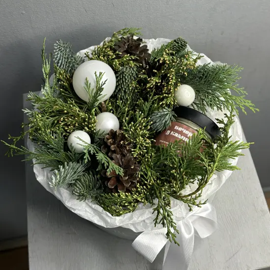 Зимняя композиция в светлой гамме: натуральные еловые веточки, шишечки, стильный декор и ароматная соевая свечаРазмер композиции- около 25-30 см