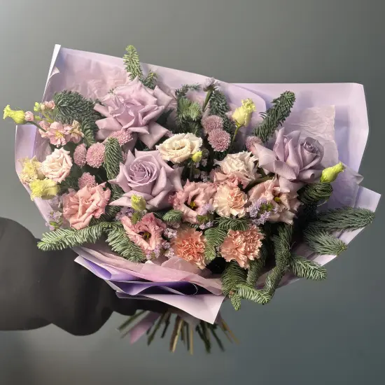 Мягкие лиловые тона переплетаются с глубокой зеленью хвои, создавая ощущение зимней сказки. Легкость эустомы контрастирует с плотными соцветиями хризантем, а крупные бутоны роз добавляют композиции благородства. Букет словно впитал в себя морозную свежесть и уют зимнего вечера.