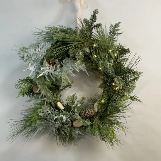 Лаконичный венок в стиле Forest выполнен из трех видов хвои, дополнен еловыми шишками, аспарагусом с эффектом инея и мягкой гирляндой. Диаметр – 40–45 см. Композиция подойдет для украшения интерьера в скандинавском или эко-стиле, станет уютным акцентом в преддверии праздников.