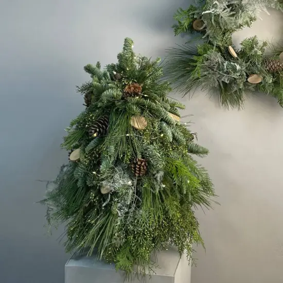Стильная ёлочка из гаммы Лес - натуральная, минималистичная, современная. Три вида ароматной хвои, еловые шишки, заснеженный аспарагус и уютная гирлянда в комплекте. Размер ёлочки - около 60 см