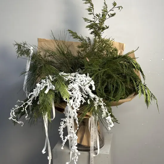 Динамичный букет с зимним настроением. Собран из ароматной хвои разных сортов и заснеженного аспарагуса. Дополнен длинными бархатными лентамиРазмер букета - около 70-75 см